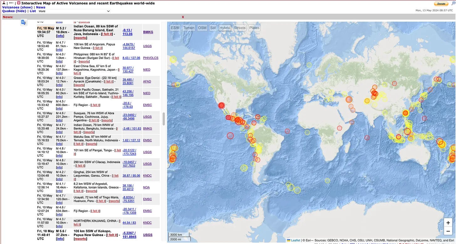 The monitored events for earthquakes and volcanic eruptions are significantly more between May 8 and 10!