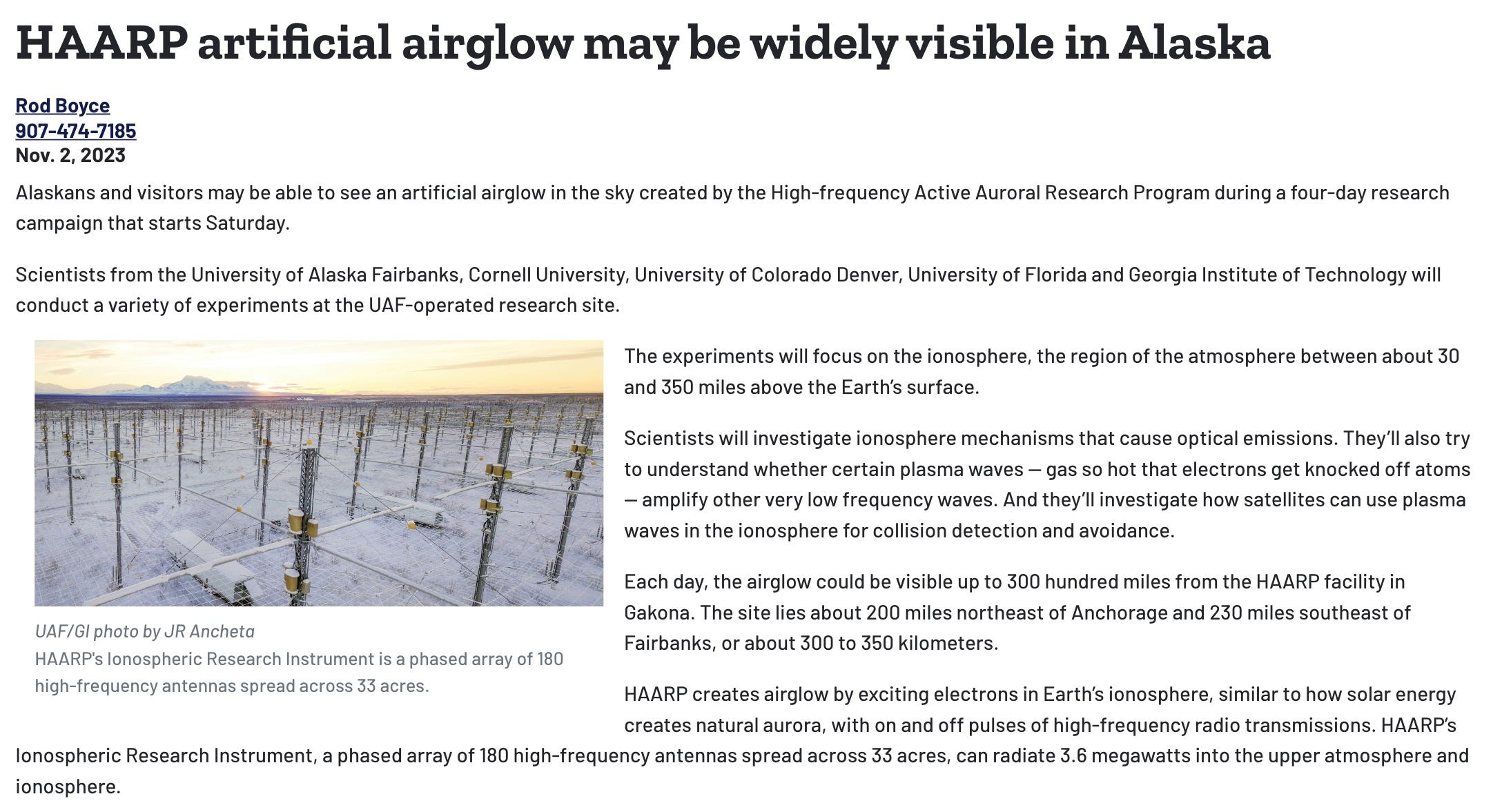 Alaskans and visitors may be able to see an artificial airglow in the sky created by the High-frequency Active Auroral Research Program during a four-day research campaign that starts Saturday.